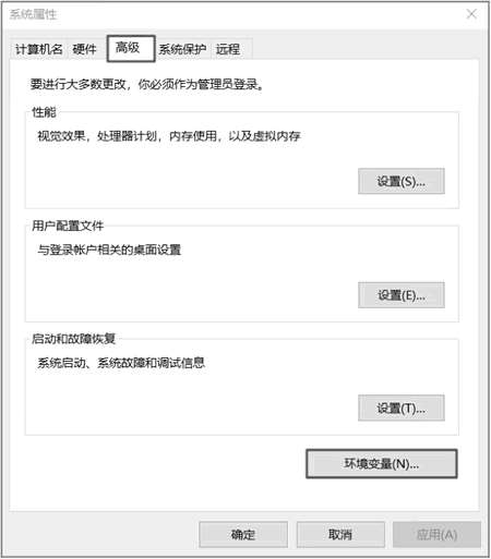 ③ 单击"高级"选项卡中的"环境变量(N)..."按钮,如下图所示。