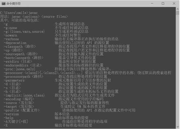 ⑥ 验证环境变量是否配置成功。关闭之前的命令行窗口,再次打开一个新的命令行窗口,否则新配置的环境变量在原来的命令行窗口不起作用。Windows+R 键,再次输入 cmd,打开命令行窗口,然后输入javac,发现在任意目录运行 javac 时不会提示"javac 不是内部或外部命令",如下图所示,说明环境变量配置成功。