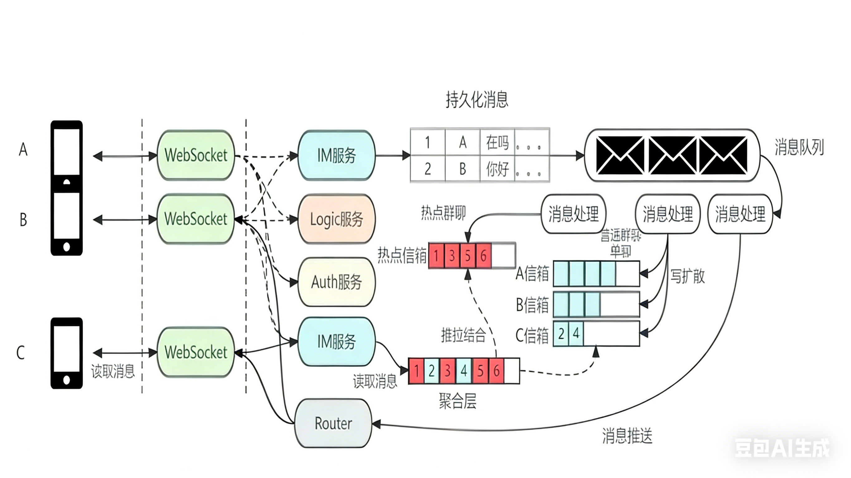 - 会话查询 :用户查询会话列表时,需要一个 聚合层 聚合用户信箱和热点信箱,并严格排序后返回给用户(即 推拉结合)。