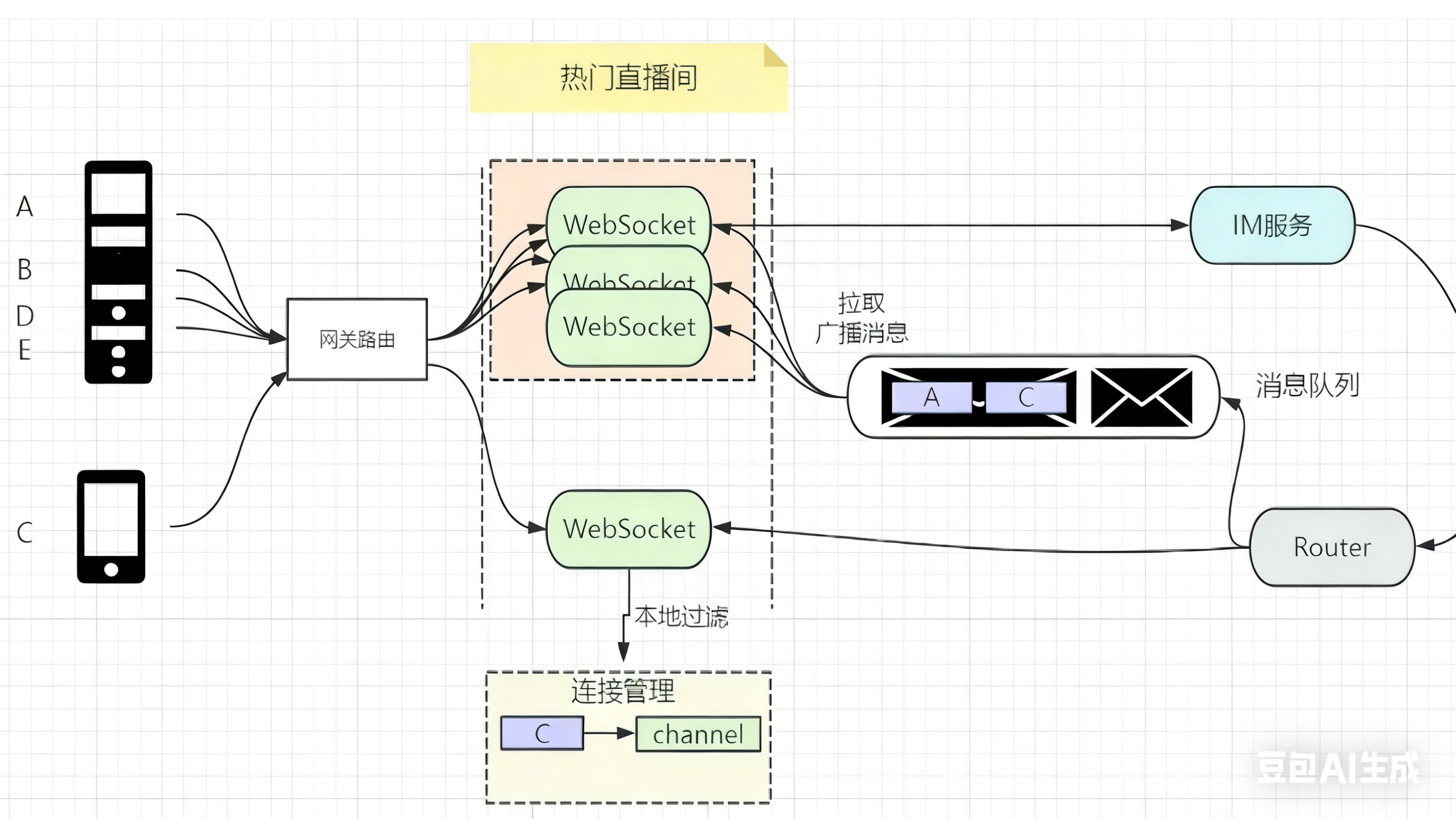- 路由 :由于用户连接在不同的 WebSocket 上,需要 Router 服务 推送到 B 和 C 所在的不同 WebSocket。