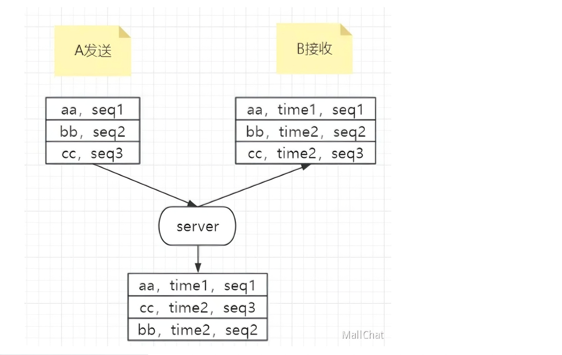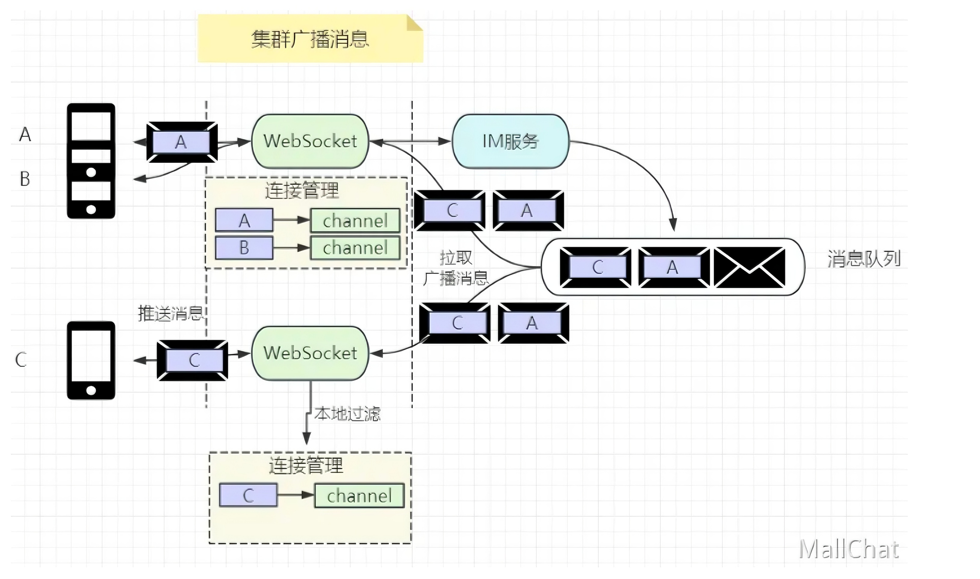 - 单聊/普通群聊:写扩散到每个群成员信箱 (如写入B和C的信箱)。