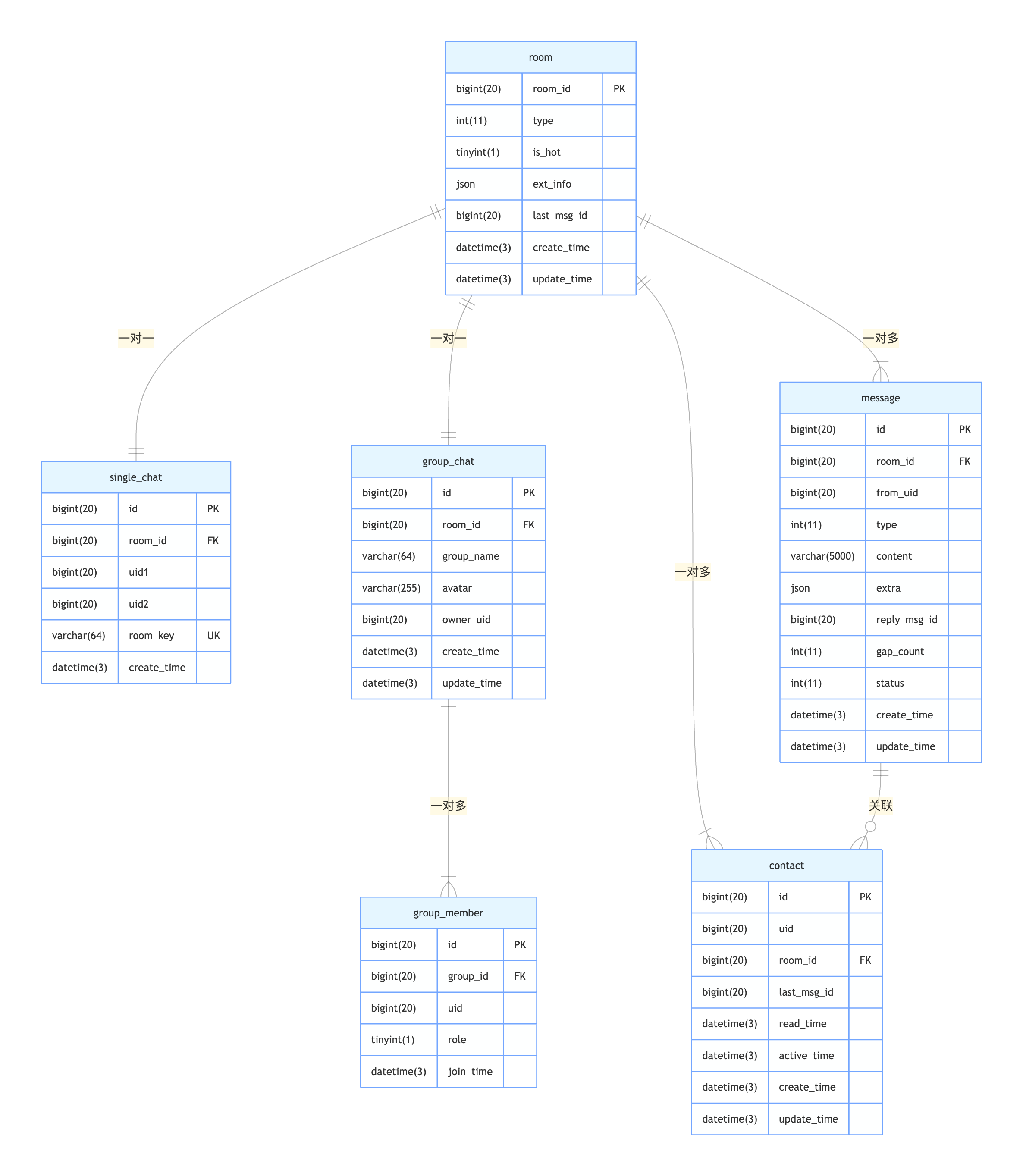 | room_id | bigint(20) | 房间唯一标识(主键),屏蔽单聊/群聊差异,作为会话唯一标识 |