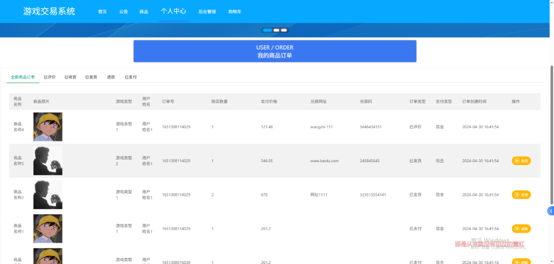 系统聚焦游戏交易全流程管理,支持商品信息的发布、编辑与展示,用户可对心仪商品进行评价与收藏;实现订单的创建、支付与跟踪功能,并设有订单投诉机制保障交易公平。基于Spring Boot框架实现各功能模块的无缝衔接,MySQL数据库确保商品、订单、评价等数据的安全存储与快速查询。系统为玩家提供便捷的交易操作入口,通过完善的功能设计规范交易行为,有效降低交易风险,提升游戏物品交易的整体体验