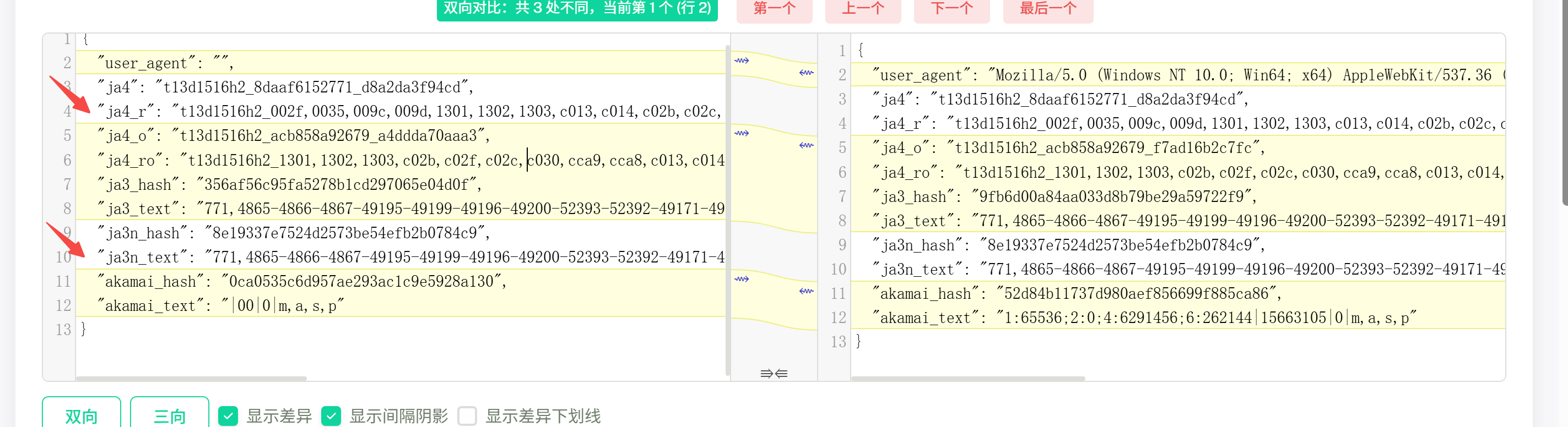 右边为chrome指纹,左边java指纹,基本上一致,中间4个指纹是会随请求改变的