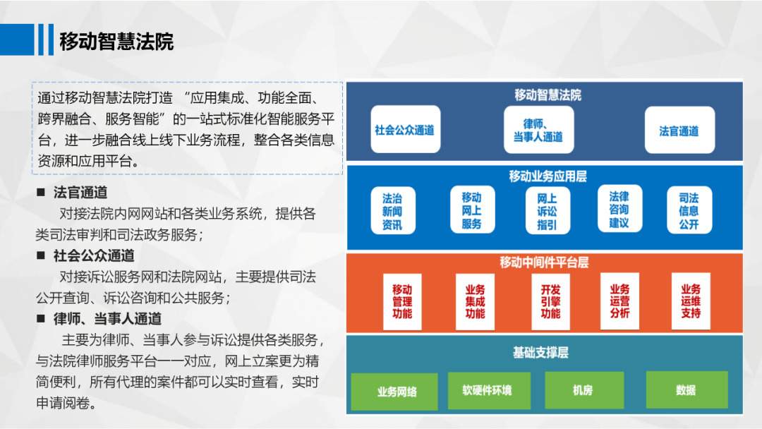 创新亮点: 移动智慧法院不仅提供了在线立案、在线缴费、在线查询等基本功能,还引入了智能咨询、在线调解等创新服务。让司法服务更加贴近民意、更加人性化。