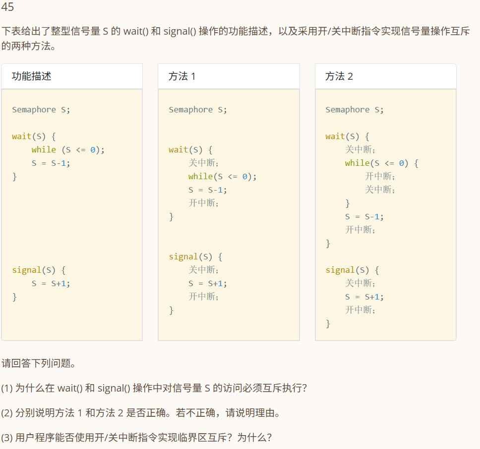 2)方法 1 错误。在 wait() 中,当 S≤0 时,关中断后,其他进程无法修改 S 的值,while 语句陷入死循环。方法 2 正确。方法 2 在循环体中有一个开中断操作,这样就可以使 其他进程修改 S 的值,从而避免 while 语句陷入死循环。
