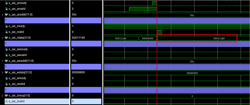 先发送axi写数据,给0x504寄存器写入0x001E_8800,表明要读取0x1E地址的数据。而后通过读取0x50C寄存器获取数据。