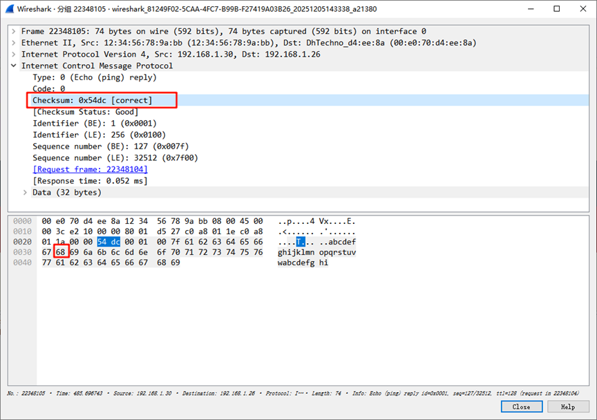 如下图所示,用wireshark抓取ping报文,发现FPGA对ping是有回复的,但是回复的报文在异常,check_sum错误,回复数据也存在异常。本应该6768696a的数据,变为676a696a,分析是存在1位的错误。