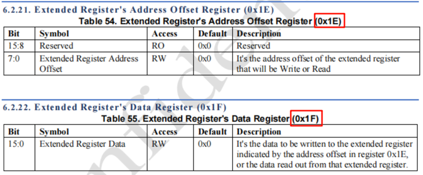 查阅YT8531SH数据手册发现,通过配置0x1E寄存器和0x1F寄存器来实现对扩展寄存器的访问。