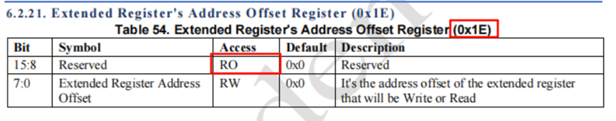 1.如下图,使用是需要配置0x1E寄存器配置为0xA003,图中显示仅【7:0】bit是可写的,【15:8】bit是仅读的,但实际测试发现,整个0x1E寄存器的16bit都是可读可写的,否则无法将0xA003写入。