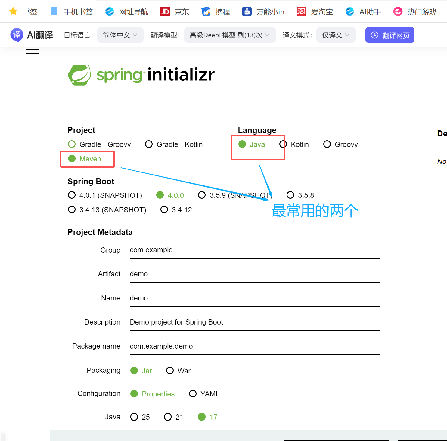 - 访问 Spring 官网(https://start.spring.io),进入 Spring Initializr 页面。