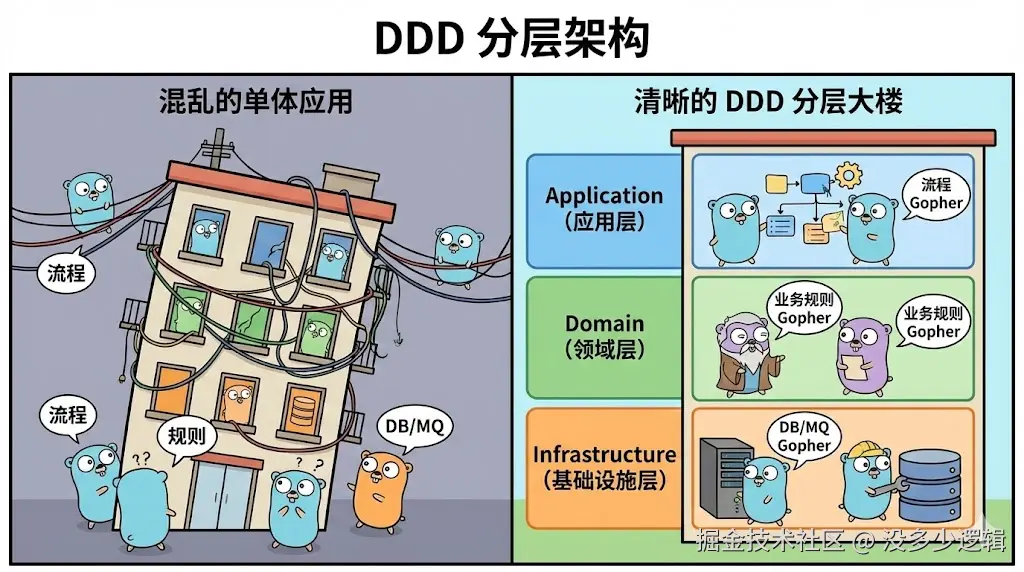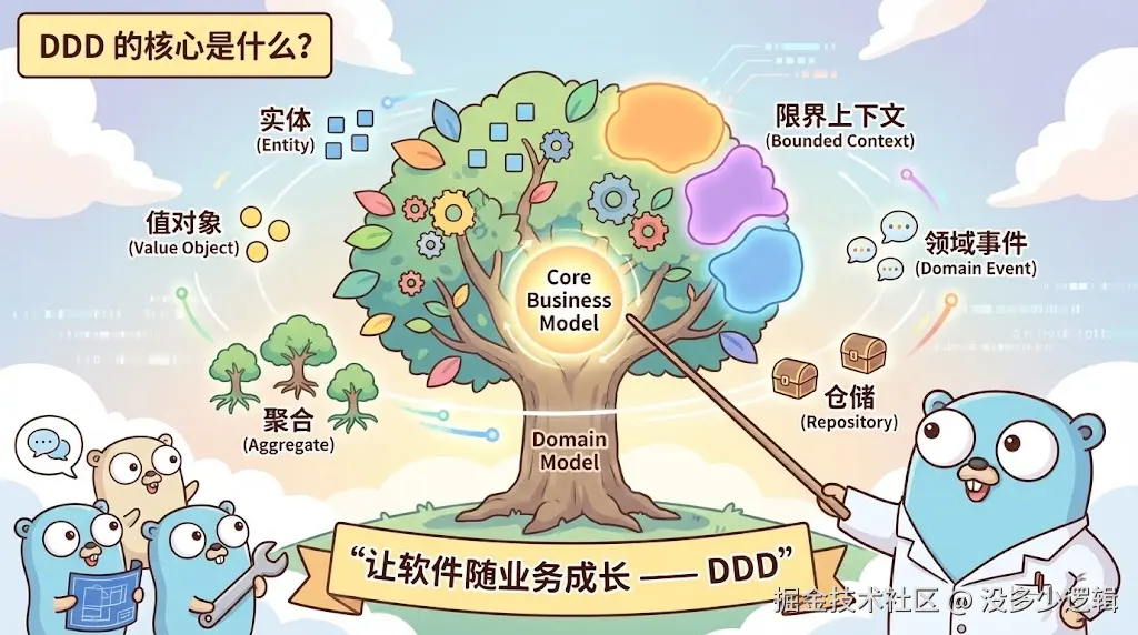 是否觉得 DDD(领域驱动设计)的概念晦涩难懂?别担心,这篇指南为你提炼了 DDD 的核心概念,拒绝烧脑,主打轻松易懂。我们将 DDD 的学习之旅分为三个阶段:理念、战术、战略。让我们跟随 Gopher 的脚步,一起探索业务建模的世界吧!