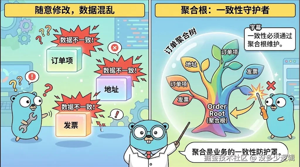聚合由一个聚合根来控制内部的所有对象,确保外界只能通过聚合根与内部交互,从而保证数据的一致性。