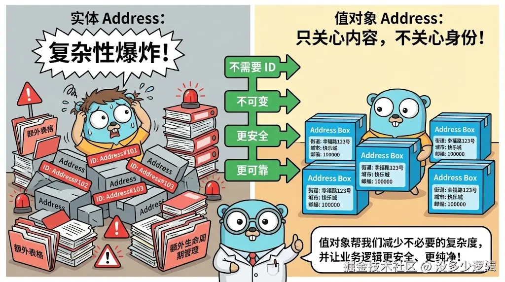 使用值对象可以避免无意义的身份维护,降低系统复杂度,同时提高安全性(因为不可变)。