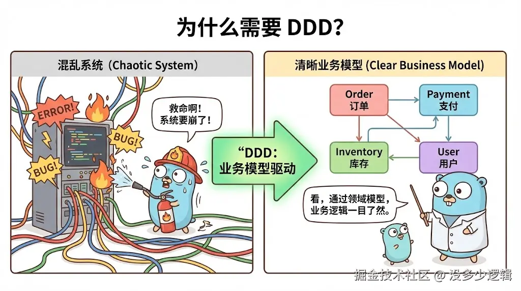 如果没有 DDD,随着业务发展,系统最终会变成一个混乱的泥潭------高耦合、错误频出、且极难维护。