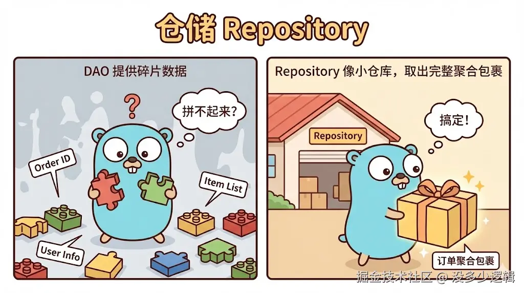 它负责隐藏数据库的具体技术细节,保持领域层的纯净。