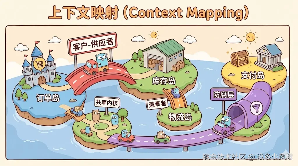 描绘了不同上下文之间的依赖关系与交流方式(如防腐层、客户-供应者等)。