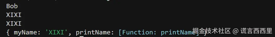 console.log(bar.myName): 指定了this指向bar,此时myName也就顺理成章的找到了bar中的myName: "XIXI"