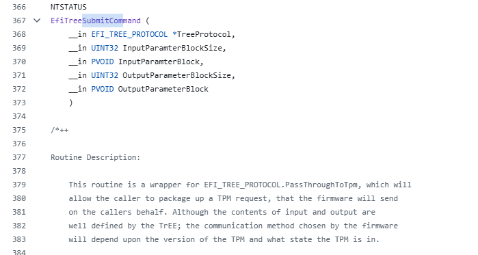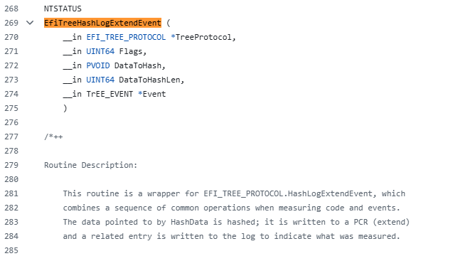 从流程图来看,最终通过函数TreeProtocol.HashLogExtendEvent扩展(修改)了PCR11寄存器的值,该函数原型及说明如下图所示,参考ntos-boot源代码