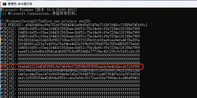 同样的方法扩展PCR11值的方法:PCR11 = SHA256(PCR11 || NewSHA256),最后得到PCR11扩展后的值为:0FE6E8F2110D5D53935C9E7D6F6BF722598B550595AABDC6E4FD2ECDF310F980