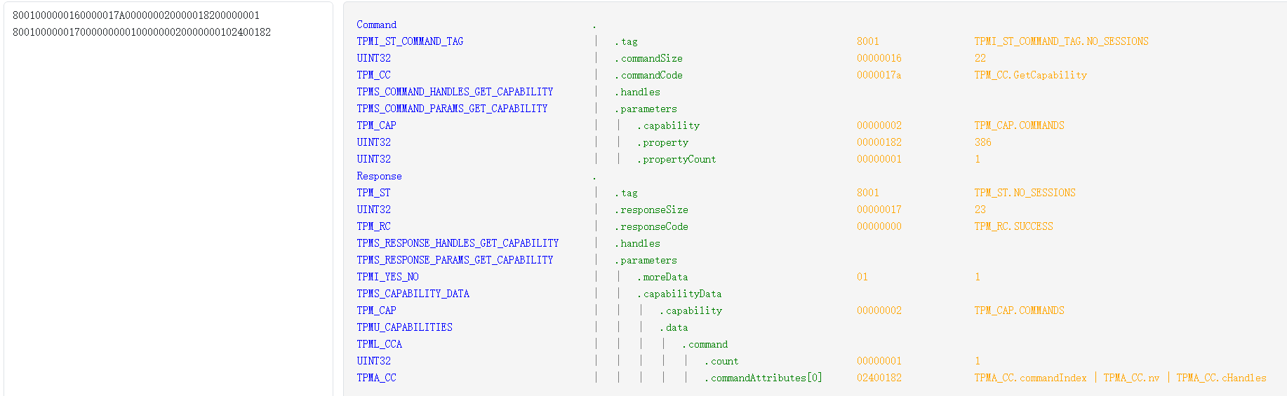 也可在线使用tpmstream工具进行查看,分别粘贴TPM命令和响应数据,该在线工具将自动识别、解释数据内容,如下图所示: