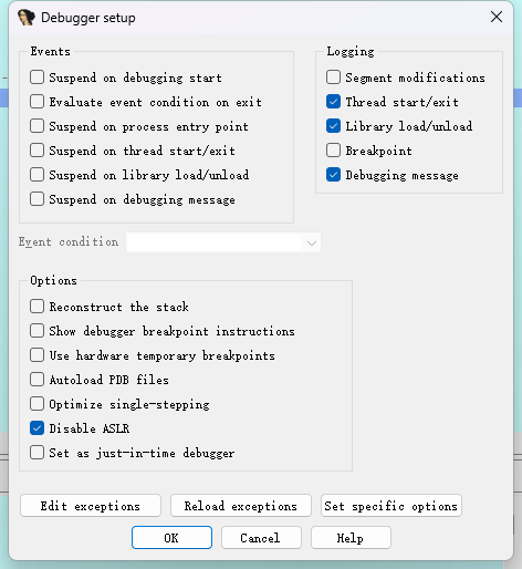 设置调试配置选项,禁用ASLR功能,这样保持静态分析的地址和动态调试的内存地址相同,方便跟踪查看调用堆栈和内存数据,配置如下图: