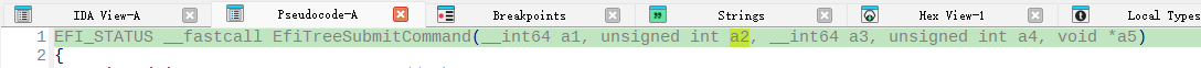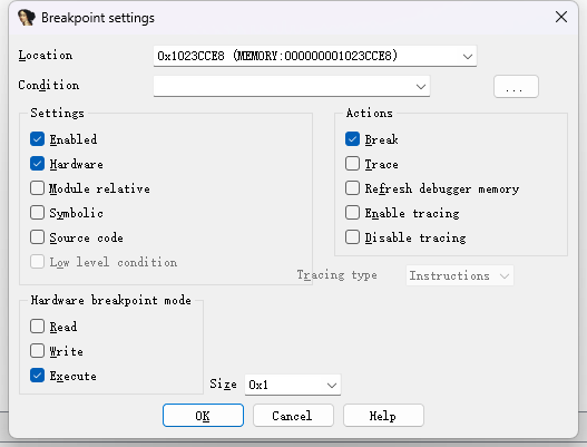 根据上一步分析得到的函数EfiTreeSubmitCommand的地址,配置IDA调试环境下,添加调试断点,如下图所示,选择硬件断点(Hardware)