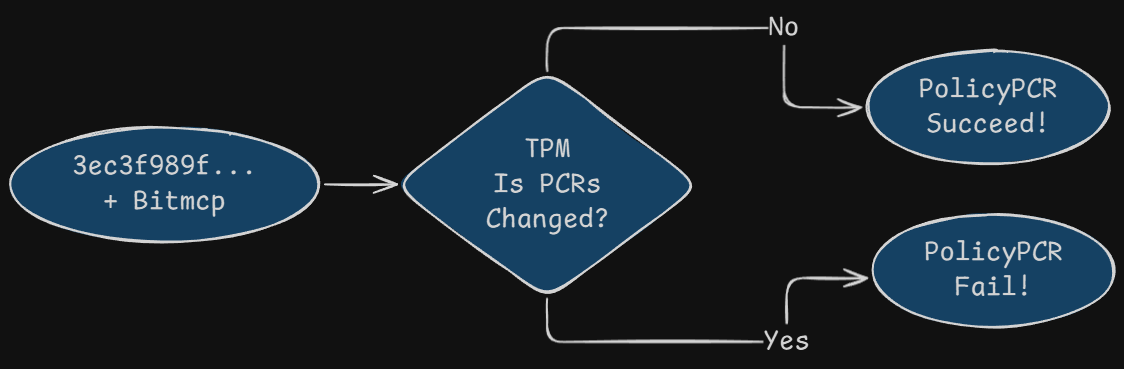 假设物理接触目标电脑,启动目标机到恢复模式(命令行环境),因为PCR7的值是通过校验机器环境得来的,在目标机上,没有修改任何配置的情况下,可以通过TPM命令读取到正确的PCR7的值。接着,假设你得到了X这样的值,通过TPM的PCR_Extend扩展命令,将PCR11的值成功修改为了0,那么,在进行TPM_CC.PolicyPCR时,你将成功通过TPM的审核,进而取得密钥!