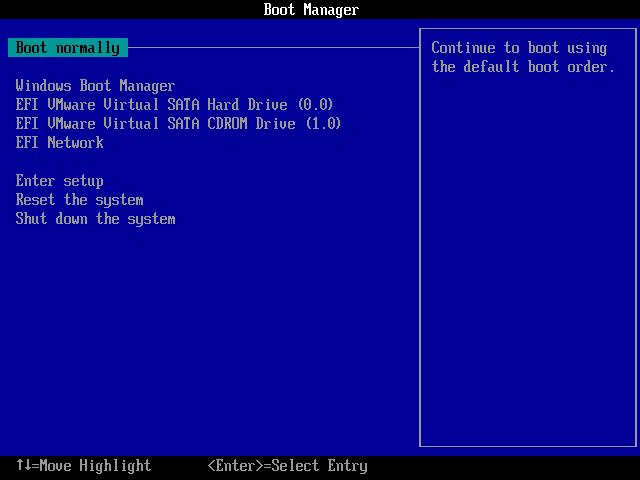 先将虚拟机启动到如下界面位置(启动虚拟机系统时,按F2),在此状态下,bootmgfw.efi模块尚未加载运行。