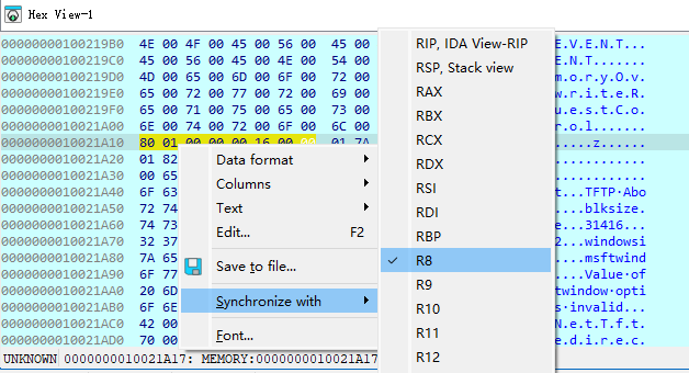 在Hex View-1中设置同步R8寄存器中的值(即参数a3),用于查看发送的TPM命令具体的数据内容,设置方法如下: