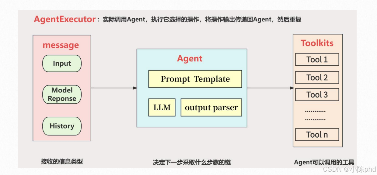- AgentExecutor:作为Agent的"执行中枢",负责调用Agent选择的操作(如调用天气API),将结果反馈给Agent,形成"决策-执行-反馈"闭环;