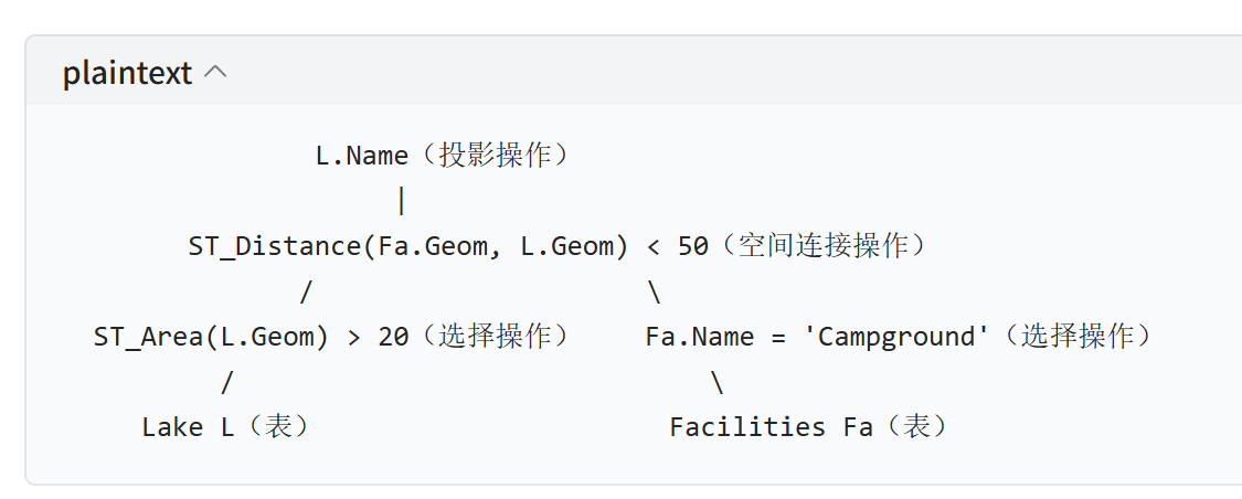 - 执行顺序:先执行两个选择操作,再执行空间连接,最后执行投影。