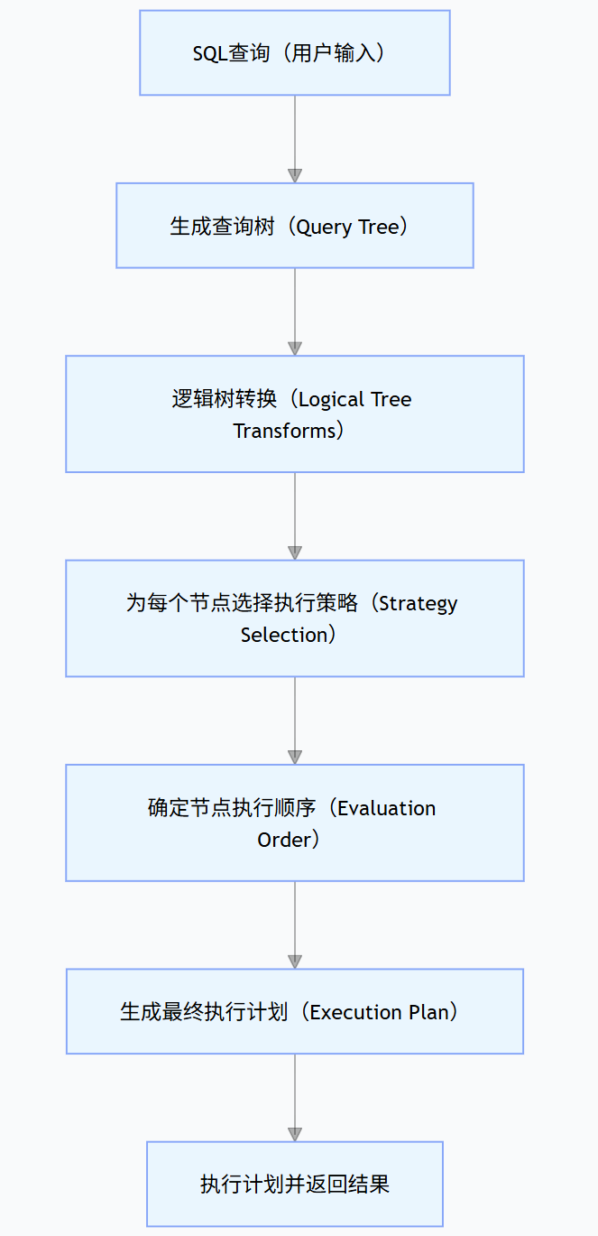 SQL 查询 → 生成查询树 → 逻辑树转换 → 策略选择 → 确定执行顺序 → 生成执行计划 → 执行并返回结果。