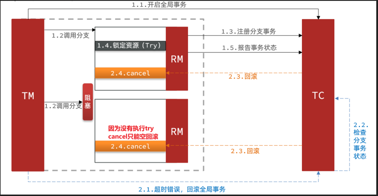 注意:cancel方法需要判断空回滚。空回滚不光是return true,还需要在数据库中记录一条cancel记录。