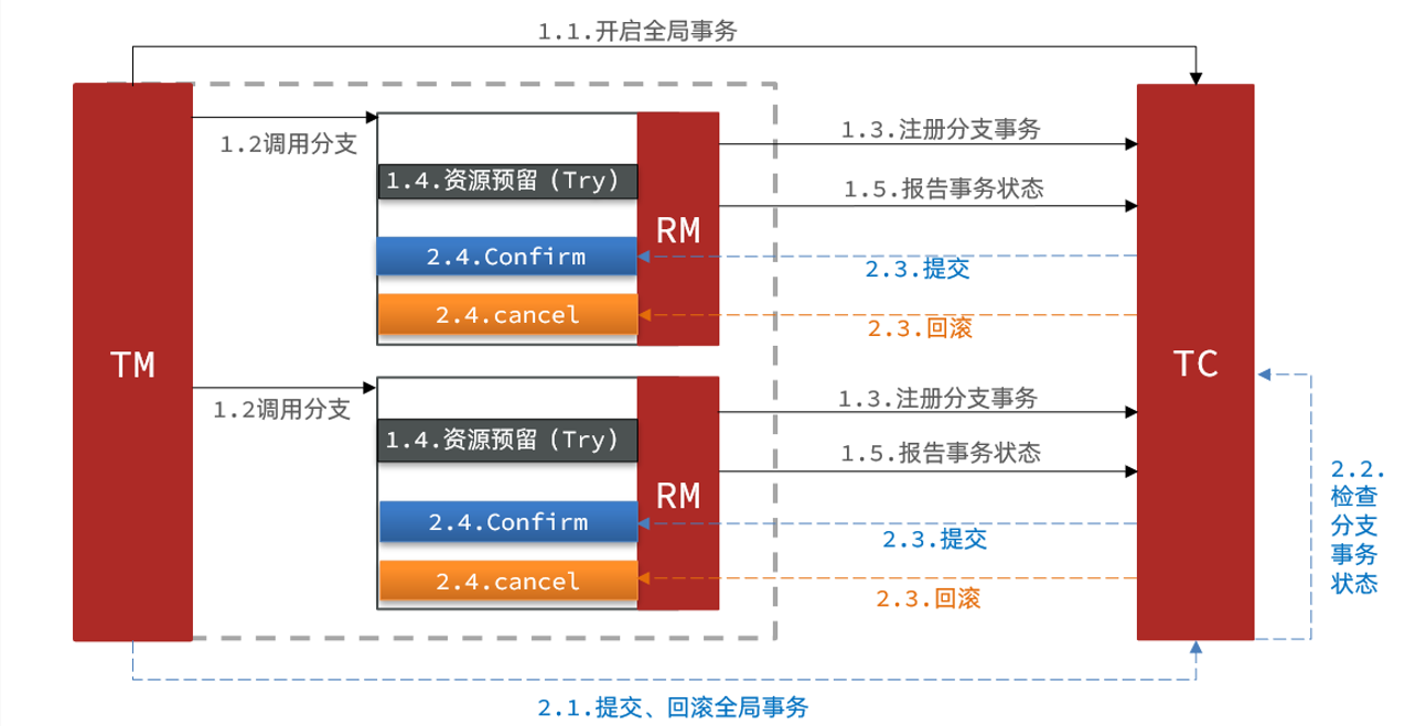 - Confirm:完成资源操作业务;要求 Try 成功 Confirm 一定要能成功。