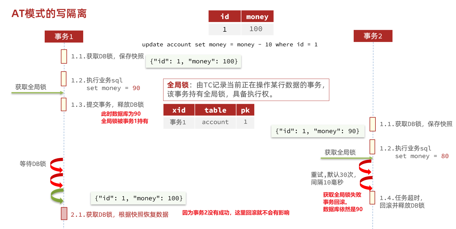 - 事务1尝试获取DB锁,因为此时事务2获取到了DB锁,所以事务1也被阻塞了。即事务1持有全局锁,等待DB锁;事务2持有DB锁,等待全局锁,出现了死锁。seata的设计是,持有DB锁的事务2会默认重试30次,每次间隔10毫秒,所以事务2会先超时回滚数据并释放DB锁,接着事务1拿到DB锁去根据快照恢复数据,这样数据就一致了