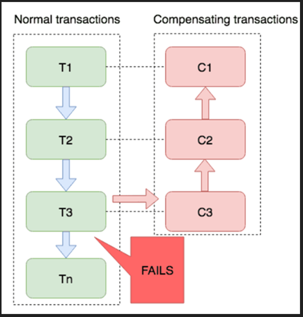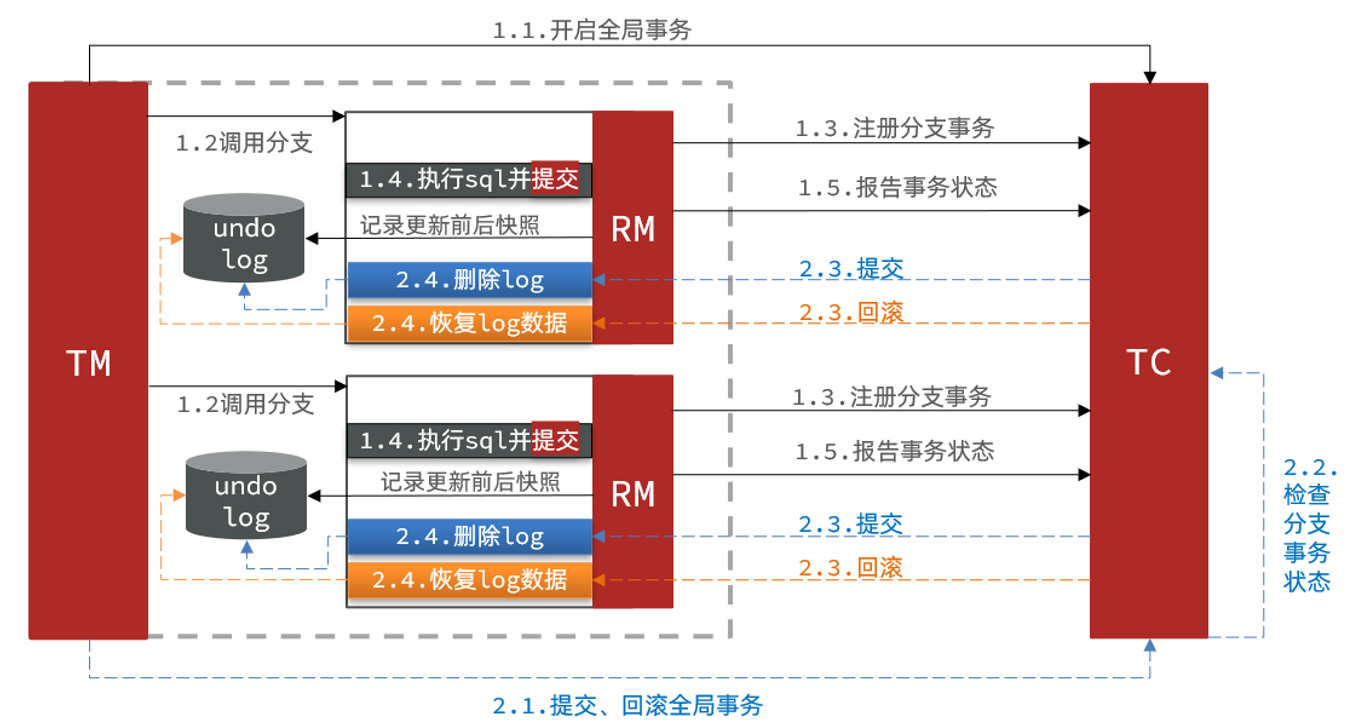 分布式事务执行过程中,依次执行各参与者的正向操作,如果所有正向操作均执行成功,那么分布式事务提交。如果任何一个正向操作执行失败,那么分布式事务会去退回去执行前面各参与者的逆向回滚操作,回滚已提交的参与者,使分布式事务回到初始状态。
