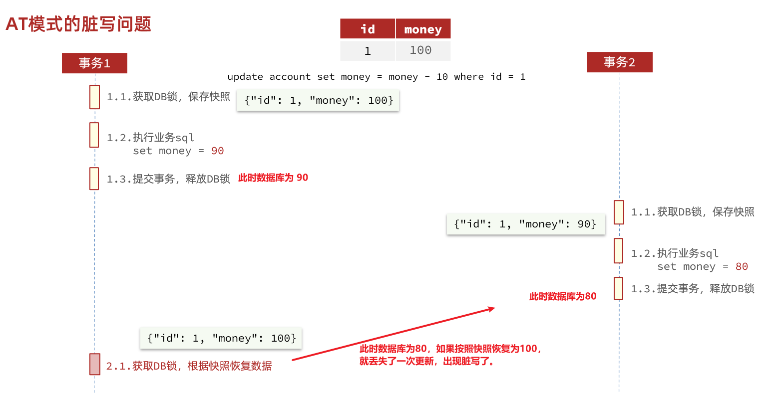 在多线程并发访问AT模式的分布式事务时,有可能出现脏写问题,如图: