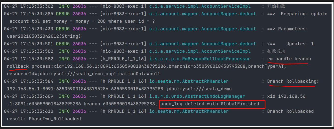 3)重启服务并测试。可以看到,扣款成功之后执行了回滚。
