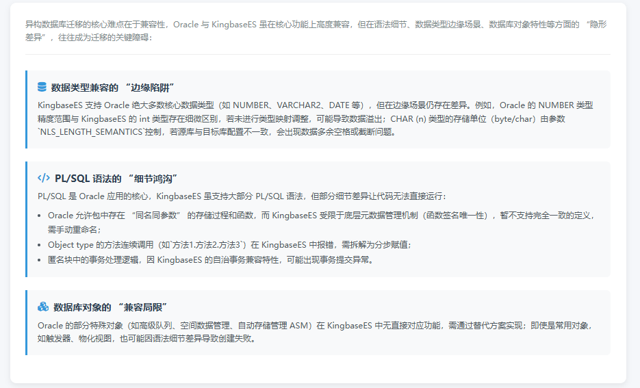 异构数据库迁移,最难啃的骨头就是兼容性。虽然 KingbaseES 和 Oracle 在核心功能上已经高度兼容了,但在语法细节、数据类型边缘场景、数据库对象特性这些方面的"隐形差异",往往会成为卡住迁移的关键障碍: