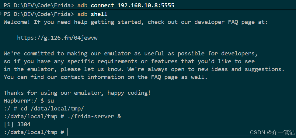 启动Frida服务:在目标Android模拟器中部署并启动frida-server,步骤同前面几章节(如图所示)。