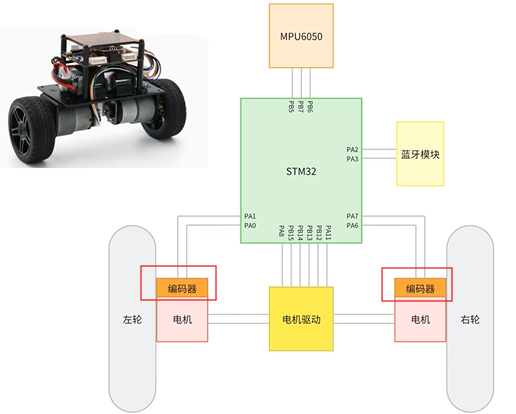 - 整体用于检测左右两个编码器的脉冲数(反映电机转动的方向和步数)。