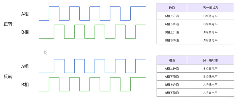 正交编码器输出 A/B 两相脉冲(相位差 90°),TIM2/TIM3 的 CH1/CH2 引脚分别接 A/B 相,定时器会根据 A/B 相的上升 / 下降沿自动增减计数 ------ 正转时计数增加,反转时计数减少,无需软件中断处理,硬件自动完成,效率极高。