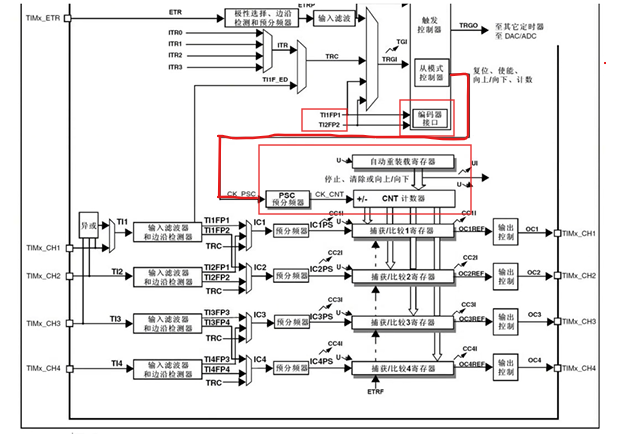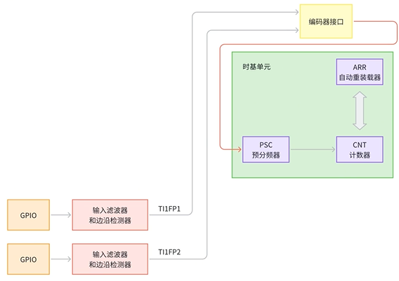 编码器脉冲可能有电磁干扰导致毛刺,滤波器会 "平滑" 输入信号 ------ 只有当引脚电平稳定 15 个定时器时钟周期后,才认为是有效脉冲,滤除短于 15 个周期的毛刺。