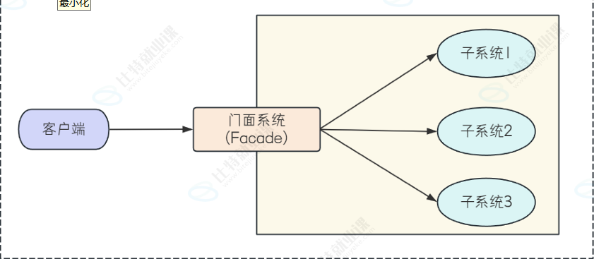 • 提⾼了灵活性,简化了客⼾端对⼦系统的使⽤难度,客⼾端⽆需关⼼⼦系统的具体实现⽅式,⽽只需 要和⻔⾯对象交互即可