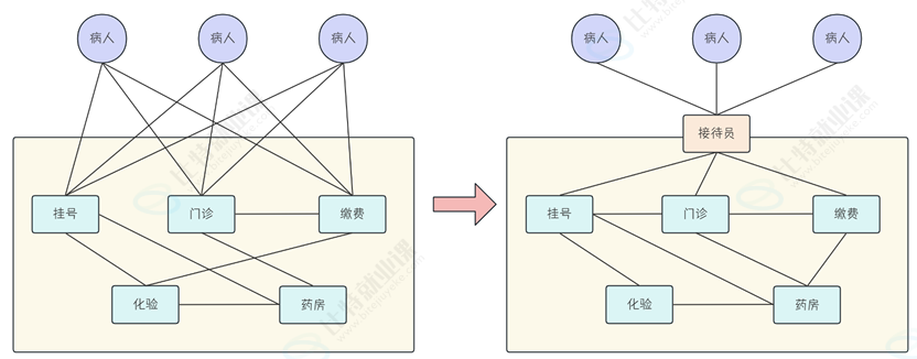 ⽐如去医院看病,可能要去挂号,⻔诊,化验,取药,让患者或患者家属觉得很复杂,如果有提供接待⼈ 员,只让接待⼈员来处理,就很⽅便.