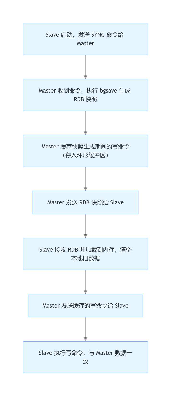 Slave 节点启动后,首次连接 Master 时触发全量同步,流程如下: