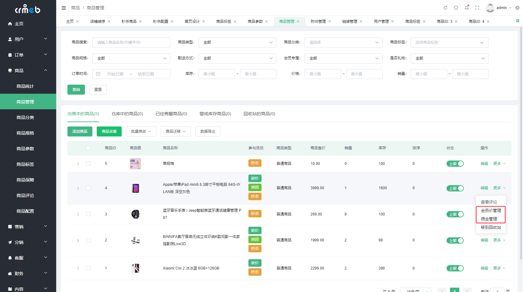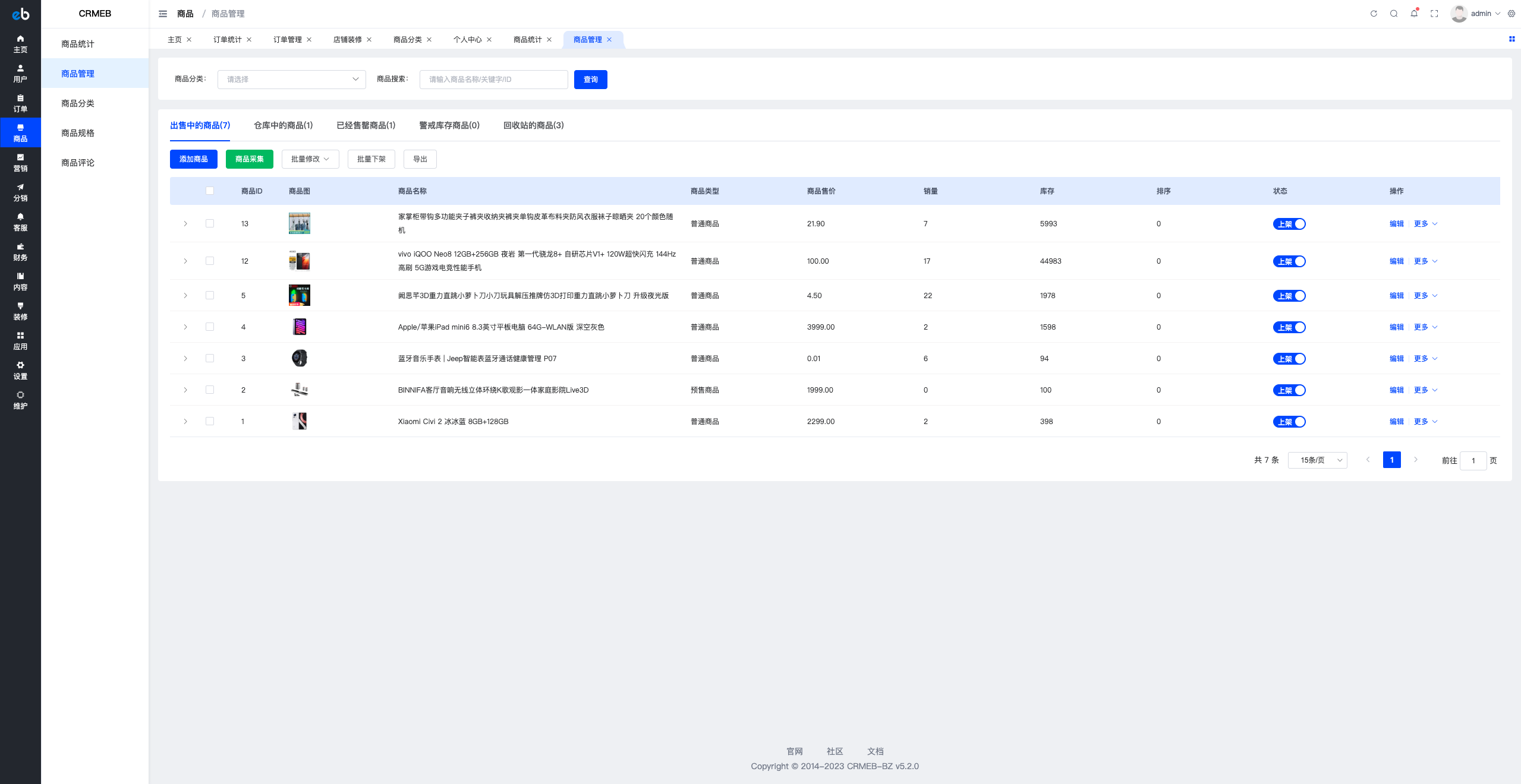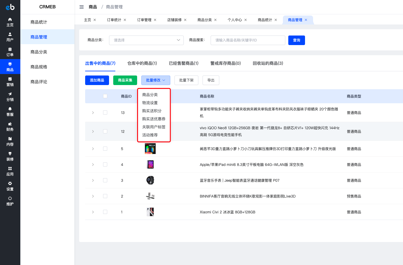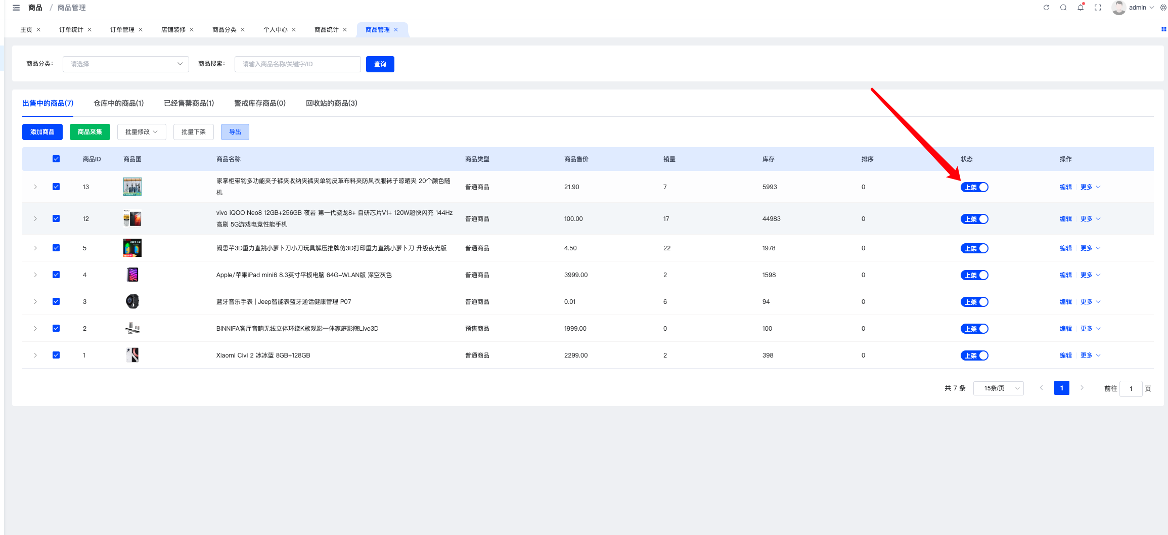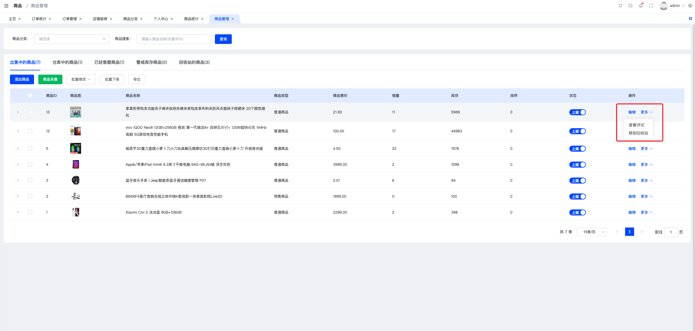 可以筛选查看售中的商品、仓库中的商品、已经售罄商品、警戒库存商品、回收站的商品;