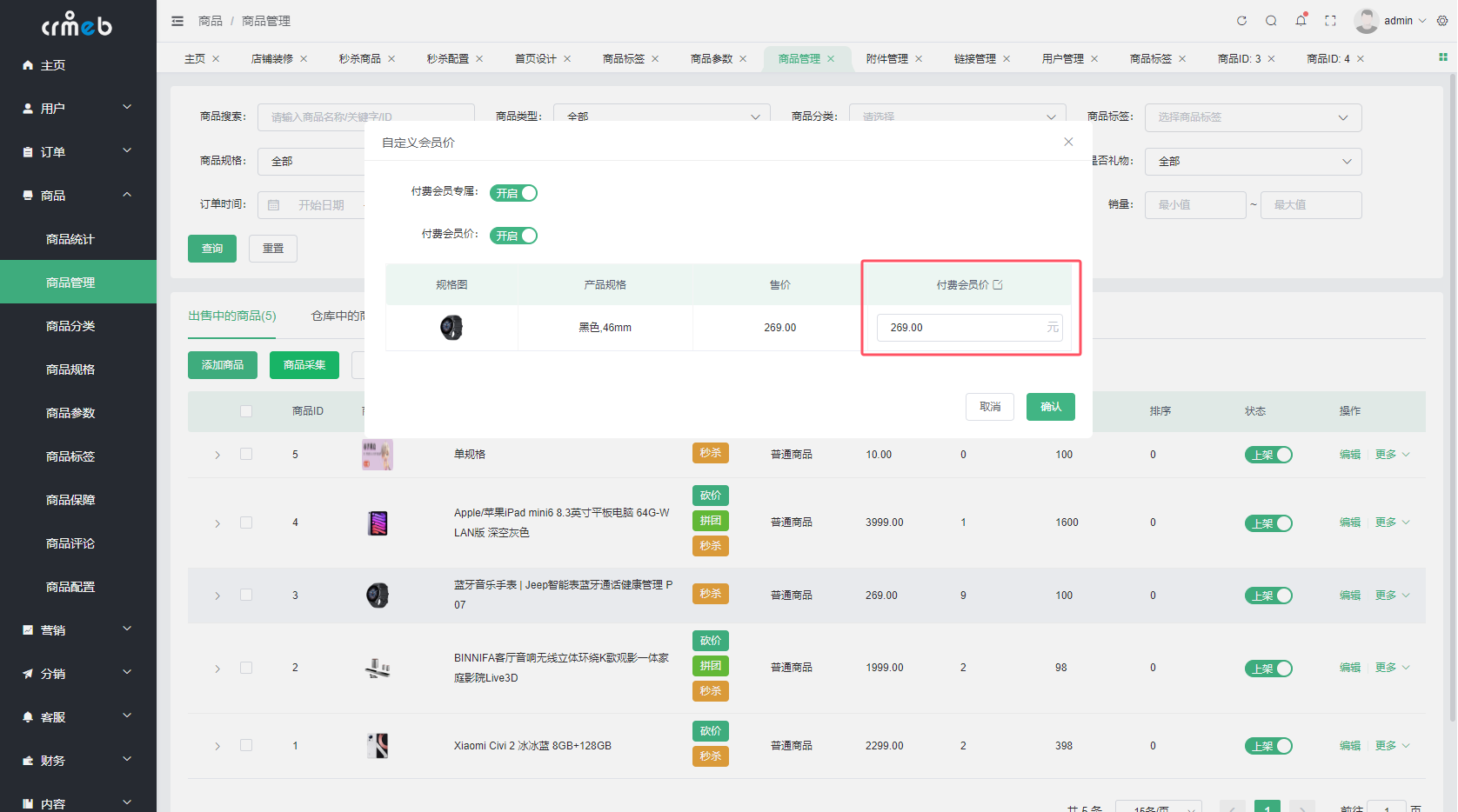 用户可以在列表上进行商品部分信息的批量修改,可以修改的数据有