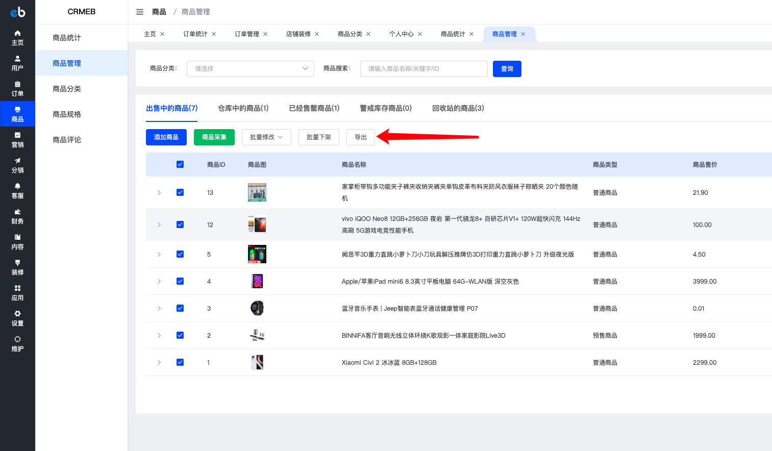 商品--->商品管理--->选择需导出商品--->导出